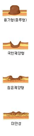 육안으로 구별을 할 때 처음에는 이미 존재하고 있던 용종 등에서의 결절이나 정상 점막의 비후가 국소로 있다가 암의 진행에 따라다음의 다섯 가지 중 한 가지의 형태 또는 혼합형으로 변합니다.
