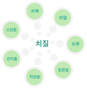 치질(痴疾)이란 한문 그대로 항문의 모든 병을 통틀어 말합니다. 항문에 생길 수 있는 병에는 항문안쪽의 혈관이 늘어나서 그것을 덮고 있는 점막이 함께 빠져나오는 치핵, 항문이 찢어지는 치열, 항문이 곪는 치루, 직장의 점막이 빠지는 직장탈, 항문이 가려운 항문 소양증, 항문에 염증이 생기는 항문염, 항문에 사마귀가 생기는 곤지롬 등 여러 가지가 있습니다.